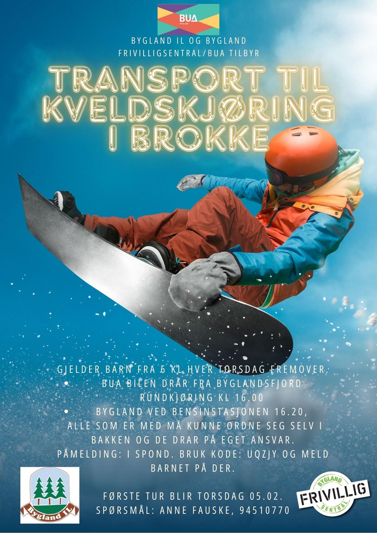 Bygland IL og Frivilligsentralen/BUA tilbyr transport til kveldskjøring på Brokke alpinsenter kvar torsdag fremover.